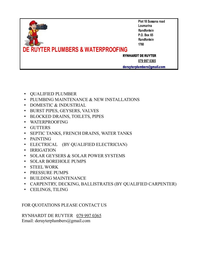 Plumbing Maintenance & New Installations Domestic & Industrial Burst Pipes, Geysers, Valves, Blocked Drains, Toilets, Waterproofing, Gutters, Painting, Damp rising Septic Tanks, French Drains, Water Tanks Electrical, Ceilings Solar & Gas Geysers, Solar Power Systems Steel Work, Tank Stands Pressure/ borehole/ pool pumps & filters Building Maintenance