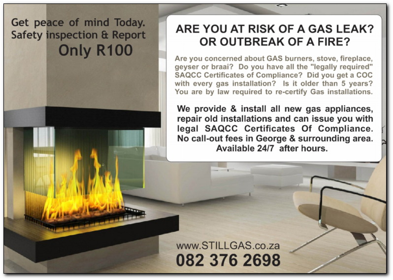 Still Gas is a Residential LPG (Gas) Sales / Service & Installation company servicing the Garden Route and surrounding areas in Clean Heating Solutions and Cooling / Freezing requirements. Clean Heating Solutions translates to a quantifiable immediate cost saving and your return on investment towards a greener footprint will change your perception s of how you invest in future. Still Gas also provides Residential Gas installation audits for SAQCC( Certificate of Compliance ) COC's for any suspecting, uncomfirmed gas installations for SAQCC approval. If need be Still Gas will rectify, retest and certity your installation. Do not be caught unawares during property transfers. Upgrade your existing electrical geyser to an instant, continuous flow gas geyser. You can go standard or advanced technology, from 5 litre per minute for your kitchen requirements to servicing your whole household or mansion. You only pay for what you use. Cooking, Heating, Cooling, Freezing requirements?