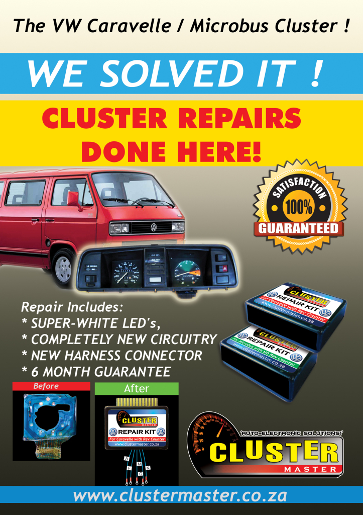 Professional REPAIRS to VW Caravelle and Microbus kombi clusters. Includes New Electronic Components Includes New Harness Connector Includes Cool White LEDs Repairs done within 24 hours Customising to your specs also done 2nd Hand Clusters available most times Trade-ins accepted CASH PAID for faulty, damaged or burnt VW Kombi clusters AGENTS wanted around SA - FREE TRAINING & FREE LISTING on our website & advertising material