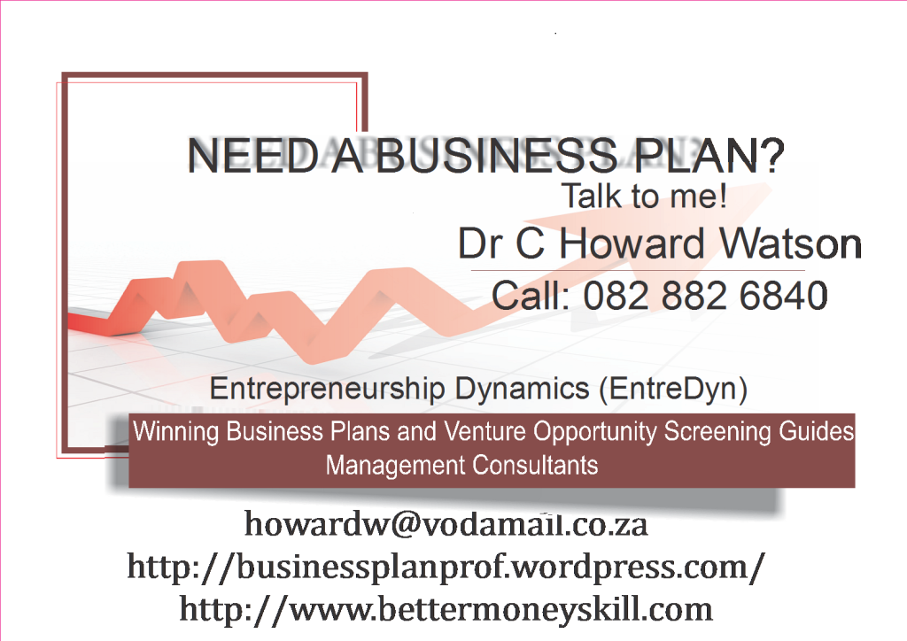 NEED A BUSINESS PLAN? Call me now at 0828826840 With combined practical and professional experience, we will assist you in the compilation, consulting and drafting of your professional Business Plan. Our consultants will also advise you and assist you in ensuring that your plan suites your needs and expectations... Our Business Plans are prepared to comply with the stringent criteria of both local and international investors, i.e. Angel Investors, Venture Capitalists, Commercial Banks (e.g. ABSA, Nedbank, Standard Bank and FNB); Small Business Finance Institutions (e.g. SEFA and Business Partners); and Government Funding Institutions (e.g. IDC, NYDA, DTI and NEF). Our Business Plans are designed to serve as a management tool for the acquisition of finance as well as for managing and growing the Client's business.
