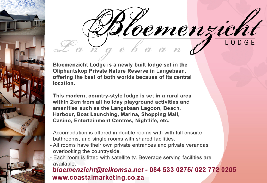 Bloemenzicht lodge is newly built modern country-style lodge set in Olifantkop Private Nature Reserve in Langebaan. This is perfect for large families, groups and friends. Please visit www.coastalmarketing.co.za