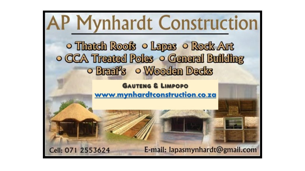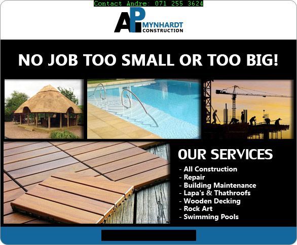 AP Mynhardt Construction does a variety of Building and Repair work AP Mynhardt Construction provides the Following Services - All Build work in and around the house - Thatch roof (Build & Repair) - Lapa's (Build & Repair) - Braai en Braai Areas - Paving - Palisades AP Mynhardt Construction's Motto " No Job Too Big or Too Small" Ap Mynhardt Construction works in the Gauteng & Limpopo Areas