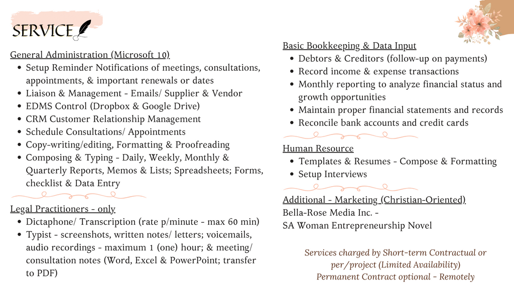 • Typist - screenshots, written notes/ letters; voicemails, audio recordings - maximum 1 (one) hour; & meeting/ consultation notes (Word, Excel & PowerPoint; transfer to PDF)